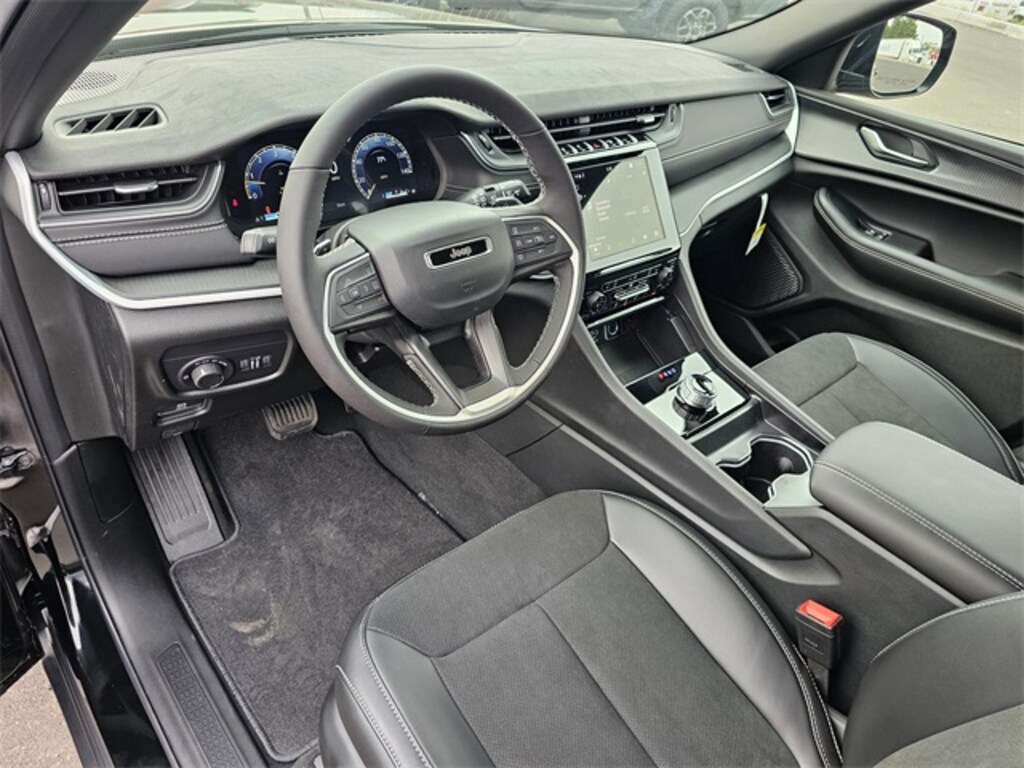 Interior: Capri leatherette/suede seats, 8-way power driver seat, 4-way manual front passenger seat, 2nd-row 60/40 bench with manual tip/slide, 3rd-row 50/50 folding seats, 7-passenger seating, 3-zone climate control, Uconnect 5 8.4 touchscreen, 10.25 driver display, Apple CarPlay/Android Auto, Jeep Connect trial, 6-speaker audio, wireless charging, full media hub with USB/Aux ports, illuminated cupholders.