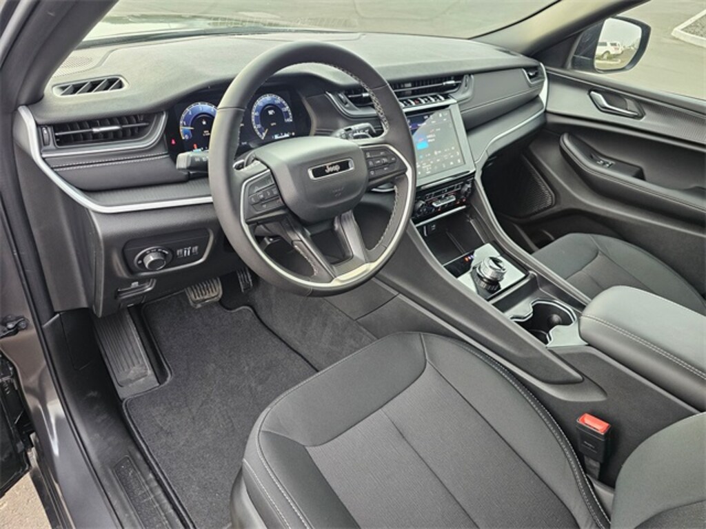 Interior: Cloth seats, 8.4 Uconnect touchscreen with 10.25 digital cluster, Apple CarPlay/Android Auto, SiriusXM 360L, Jeep Connect services, heated front seats and steering wheel, dual-zone climate control, full-function media hub with USB/aux ports, wireless charging, 2nd-row USB charge ports, 8-way power driver seat, 4-way manual front passenger seat, power liftgate, 115V auxiliary outlet, rain-sensitive windshield wipers.