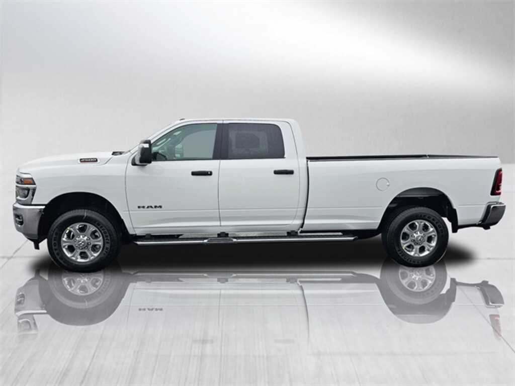 Exterior: Finished in Bright White Clear-Coat, this Ram 2500 Big Horn features 18-inch polished aluminum wheels, LT275/70R18E all-season tires, and a full-size spare tire. Exterior highlights include LED low/high reflector headlamps, front LED fog lamps, automatic headlamps, a locking tailgate, and a tailgate-handle LED hitch lamp. Towing and utility features include a Class V receiver hitch, 7-pin and 4-pin trailer wiring, trailer brake controller, LED bed lighting, deployable bed step by Mopar, spray-in bedliner by Mopar, forward and reverse utility lights, and chrome flat wheel-to-wheel side steps.